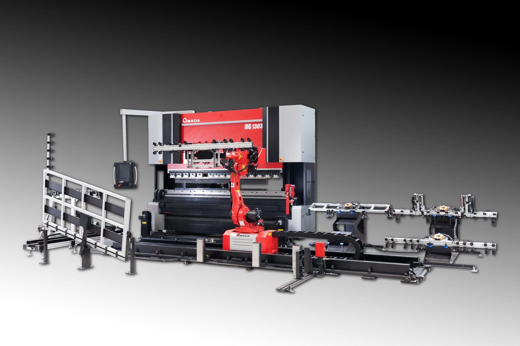 HG-Rm využíva špičkový ohraňovací lis HG-1303, najlepší ohýbací výkon s novým hybridným systémom pohonu. Ohraňovací lis je integrovaný s jedným 7-osovým kĺbovým robotom a sériou inteligentných zariadení zameraných špeciálne na ohýbanie zložitých rebrových a veľkých panelových dielov.
